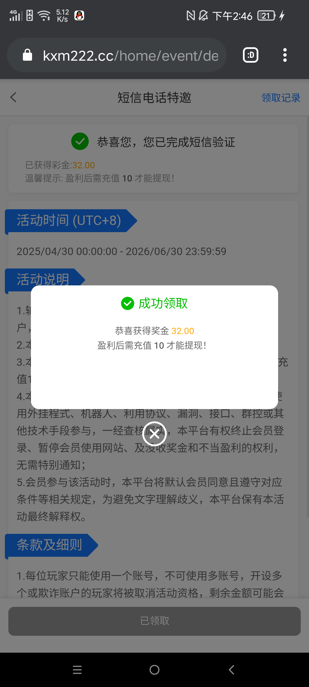 新用户注册绑卡,优惠中心自助手机号领取32彩金,活动要求达到要求,10倍流水才可以提现,自行测试